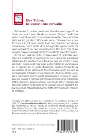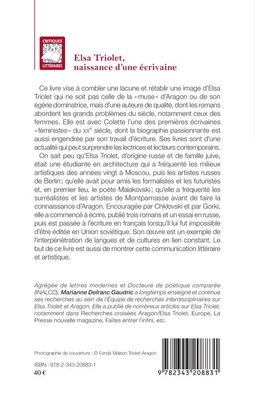 Ce livre vise à combler une lacune et rétablir une image d'Elsa Triolet qui ne soit pas celle de la muse d'Aragon ou de son égérie dominatrice, mais d'une auteure de qualité, dont les romans abordent les grands problèmes du siècle, notamment ceux des femmes. Elle est avec Colette l'une des premières écrivaines féministes du xxe siècle, dont la biographie passionnante est aussi engendrée par son travail d'écriture. Encouragée par Chklovski et par Gorki, elle a commencé à écrire, publié trois romans et un essai en russe, puis est passée à l'écriture en français lorsqu'il lui fut impossible d'être éditée en Union soviétique. Son oeuvre est un exemple de l'interpénétration de langues et de cultures en lien constant. Le but de ce livre est aussi de montrer cette communication littéraire et artistique.