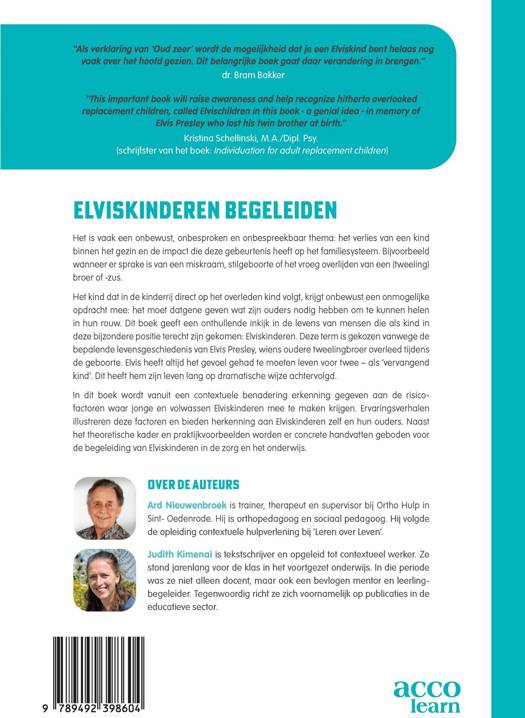 In dit boek wordt vanuit een contextuele benadering erkenning gegeven aan de risicofactoren waar jonge en volwassen Elviskinderen mee te maken krijgen. Ervaringsverhalen illustreren deze factoren en bieden herkenning aan Elviskinderen zelf en hun ouders. Naast het theoretische kader en praktijkvoorbeelden worden er concrete handvatten geboden voor de begeleiding van Elviskinderen in de zorg en het onderwijs.
