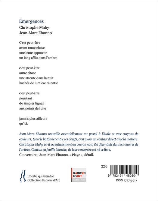 Jean-Marc Éhanno travaille essentiellement au pastel à l’huile et aux crayons de couleurs ; tenir le bâtonnet entre ses doigts, c’est avoir un contact direct avec la matière. Christophe Mahy écrit essentiellement au crayon noir, il a déambulé dans les œuvres de l’artiste. Chacun sa feuille blanche, de leur rencontre est né ce livre.