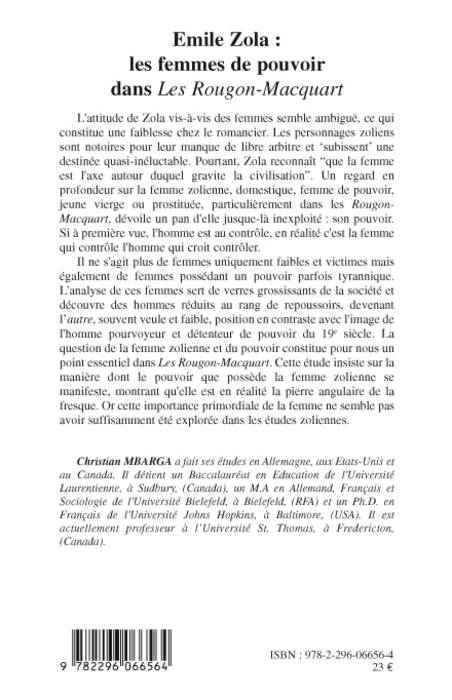 L'attitude de Zola vis-à-vis des femmes semble ambiguë, ce qui constitue une faiblesse chez le romancier. Les personnages zoliens sont notoires pour leur manque de libre arbitre et "subissent" une destinée quasi-inéluctable. Pourtant Zola reconnaît "que la femme est l'axe autour duquel gravite la civilisation". Un regard en profondeur sur la femme zolienne, domestique, femme de pouvoir, jeune vierge ou prostituée, particulièrement dans les Rougon-Macquart, dévoile un pan d'elle jusque-là inexploité : son pouvoir.