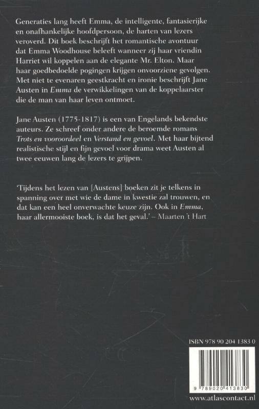 In 'Emma' beschrijft Jane Austen het romantische avontuur dat Emma Woodhouse beleeft wanneer zij haar vriendin Harriet wil koppelen aan de elegante Mr. Elton. Haar goedbedoelde pogingen krijgen echter onvoorziene gevolgen. Met haar niet te evenaren geestkracht en ironie beschrijft Jane Austen in Emma de verwikkelingen van de koppelaarster die de man van haar leven ontmoet.