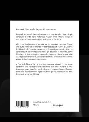 Emma de Normandie, la première couronne, premier volet d’une trilogie consacrée à cette figure historique majeure, plonge le spectateur au cœur des intrigues politiques du XIe siècle. Alors que l’Angleterre est secouée par les invasions danoises, Emma, une jeune princesse normande, voit sa vie basculer. Mariée à Æthelred le Malavisé, elle devient reine consort et doit naviguer entre les alliances complexes et les rivalités sans merci qui déchirent le royaume. Entre histoire et fiction, cette pièce explore les tourments d’une femme prise au piège des événements, confrontée à la fois à la violence des hommes et aux limites imposées à son pouvoir.