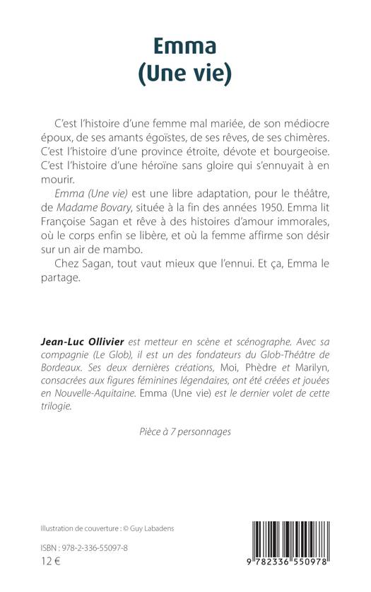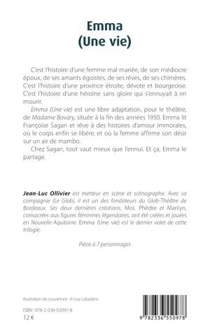 C'est l'histoire d'une femme mal mariée, de son médiocre époux, de ses amants égoïstes, de ses rêves, de ses chimères. C'est l'histoire d'une province étroite, dévote et bourgeoise. C'est l'histoire d'une héroïne sans gloire qui s'ennuyait à en mourir. Emma (Une vie) est une libre adaptation, pour le théâtre, de Madame Bovary, située à la fin des années 1950. Emma lit Françoise Sagan et rêve à des histoires d'amour immorales, où le corps enfin se libère, et où la femme affirme son désir sur un air de mambo. Chez Sagan, tout vaut mieux que l'ennui. Et ça, Emma le partage.