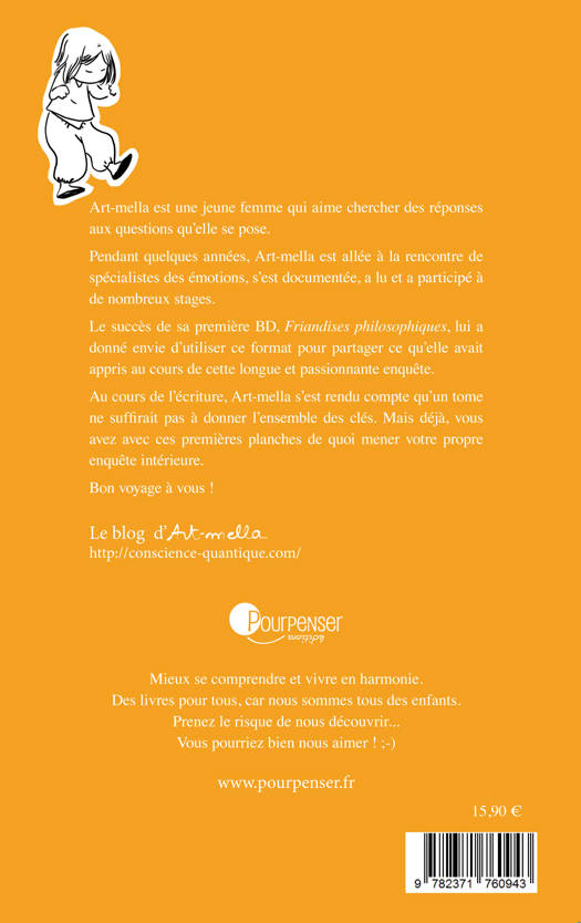 Art-mella est une jeune femme qui aime chercher des réponses aux questions qu'elle se pose. Pendant quelques années, Art-mella est allée à la rencontre de spécialistes des émotions, s'est documentée, a lu et a participé à de nombreux stages. Le succès de sa première BD, Friandises philosophiques, lui a donné envie d'utiliser ce format pour partager ce qu'elle avait appris au cours de cette longue et passionnante enquête. Au cours de l'écriture, Art-mella s'est rendu compte qu'un tome ne suffirait pas à donner l'ensemble des clés. Mais déjà, vous avez avec ces premières planches de quoi mener votre propre enquête intérieure. Bon voyage à vous !