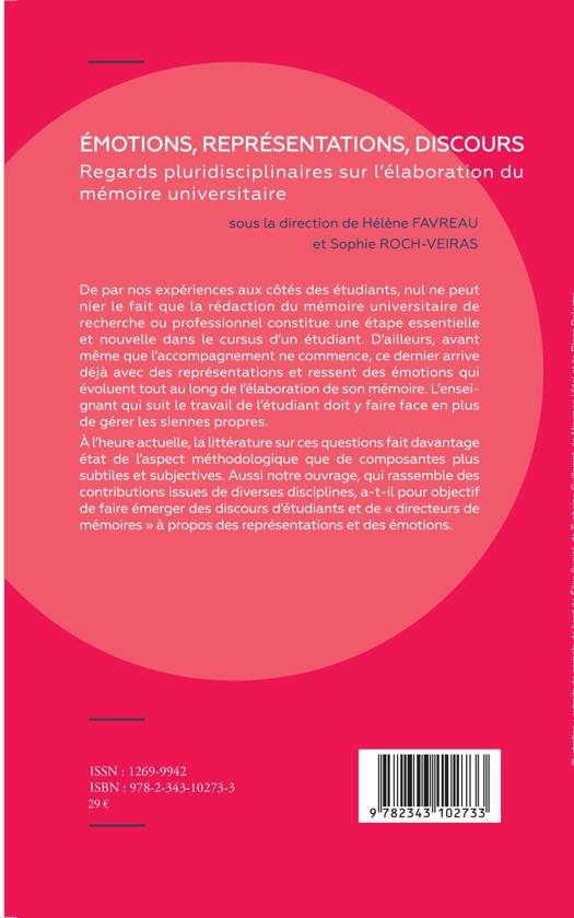 Nul ne peut nier le fait que la rédaction du mémoire universitaire, qu'il soit de recherche ou professionnel, constitue une étape essentielle et nouvelle dans le cursus d'un étudiant. Ce dernier s'est d'ailleurs déjà forgé des représentations à ce sujet. A l'heure actuelle, la littérature sur ces questions fait davantage état de l'aspect méthodologique. C'est pourquoi ces contributions ont pour objectif de faire émerger des discours d'étudiants et de directeurs de mémoire à propos des représentations et des émotions s'y rapportant.