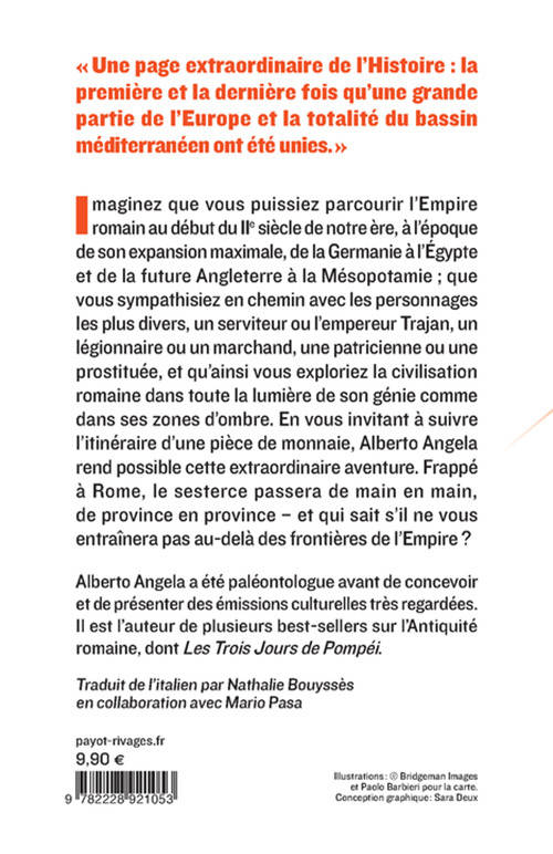 Imaginez que vous puissiez parcourir l'Empire romain au début du iie siècle de notre ère, à l'époque de son expansion maximale, de la Germanie à l'Égypte et de la future Angleterre à la Mésopotamie ; que vous sympathisiez en chemin avec les personnages les plus divers, un serviteur ou l'empereur Trajan, un légionnaire ou un marchand, une patricienne ou une prostituée, et qu'ainsi vous exploriez la civilisation romaine dans toute la lumière de son génie comme dans ses zones d'ombre. En vous invitant à suivre l'itinéraire d'une pièce de monnaie, Alberto Angela rend possible cette extraordinaire aventure. Frappé à Rome, le sesterce passera de main en main, de province en province - et qui sait s'il ne vous entraînera pas au-delà des frontières de l'Empire ?