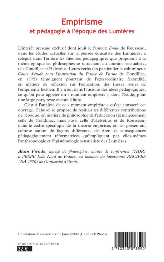Il y a eu dans l'histoire des idées pédagogiques ce que l'on peut appeler un "moment empiriste" dont l'étude, pour une large part, reste encore à faire. C'est à l'analyse de ce moment empiriste qu'est consacré cet ouvrage. Il se propose de restituer les différentes contributions de l'époque en matière de philosophie de l'éducation (Condillac, Helvetius, Rousseau) et de tirer les conséquences pédagogiquement réformatives qu'impliquent par elles-mêmes l'anthropologie et l'épistémologie sensualiste des Lumières.