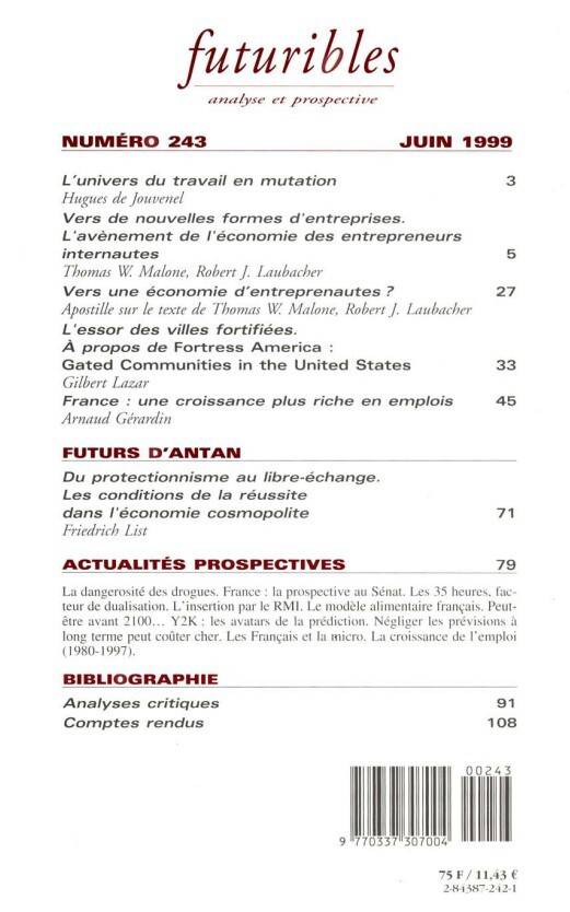 L’essor des villes fortifiées. À propos de Fortress America : Gated Communities in the United States Lazar Gilbert 1 France : une croissance plus riche en emploi GÉRARDIN Arnaud 2 Futurs d’antan Du protectionnisme au libre-échange. Les conditions de la réussite dans l’économie cosmopolite LIST Friedrich