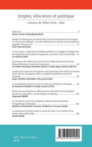 Dans ce numéro 44 de la revue des Cahiers de l'IREA trois thèmes sont traités à savoir: l'emploi, l'éducation et la politique. Dans le thème relatif à l'emploi, deux auteurs présentent des analyses relatives aux stratégies d'insertion socioprofessionnelles. Pour le thème inhérent à l'éducation, trois auteurs traitent des questions relatives à l'éducation inclusive, à la gestion des classes et à la symbolique de la consommation d'aliments dits religieux. À propos du thème relatif à la politique, trois auteurs analysent entre autres l'alternance politique locale, l'urbanisation des communes rurales et l'ordre politique colonial.