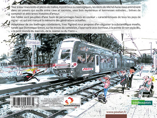 Tour à tour truculents et pleins de malice, mystérieux ou nostalgiques, les récits de Michel Aulas nous emmènent dans un univers qui oscille entre cave et sacristie, sous bois mystérieux et kermesses estivales… brèves de comptoir et enivrantes histoires d’amour. Ces fables sont peuplées d’une foule de personnages hauts en couleur – caractéristiques de tous les pays de vigne – et qui ont marqué la mémoire des générations actuelles. Adaptateur de ces badinages rabelaisiens, Yves Pignard nous propose d’en déguster la substantifique moelle, tandis que Dominique Simon, sur les traces du comédien, s’approprie avec bonheur, à la pointe de son stylo Bic, « le petit monde du Joannès, de la Jeanne ou du Piarre ».