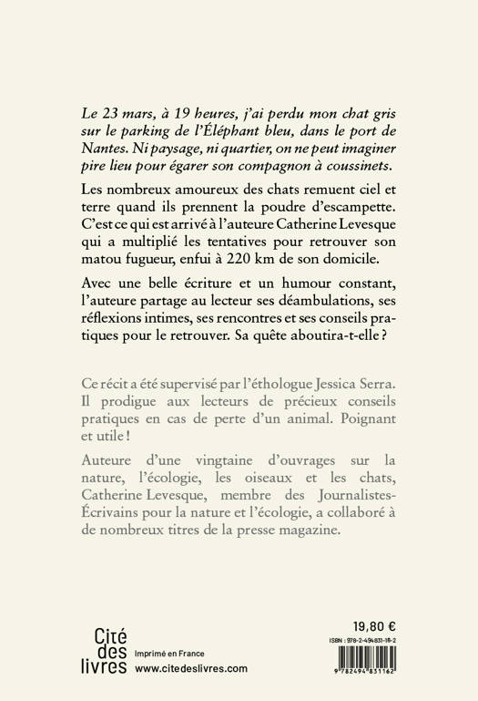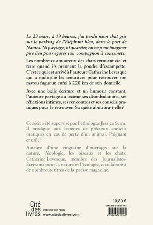Le 23 mars, à 19 heures, j’ai perdu mon chat gris sur le parking de l’Éléphant bleu, dans le port de Nantes. Ni paysage, ni quartier, on ne peut imaginer pire lieu pour égarer son compagnon à coussinets. Les nombreux amoureux des chats remuent ciel et terre quand ils prennent la poudre d’escampette. C’est ce qui est arrivé à l’auteure Catherine Levesque qui a multiplié les tentatives pour retrouver son matou fugueur, enfui à 220 km de son domicile. Avec une belle écriture et un humour constant, l’auteure partage avec le lecteur ses déambulations, ses réflexions intimes, ses rencontres et ses conseils pour le rechercher. Sa quête aboutira-t-elleâ? Ce récit a été supervisé par l’éthologue Jessica Serra. Il prodigue aux lecteurs de précieux conseils pratiques en cas de perte d’un animal. Poignant et utileâ! Membre des Journalistes-écrivains pour la nature et l’écologie, Catherine Levesque a collaboré à de nombreux titres de la presse magazine et a écrit plus d’une vingtaine d’ouvrages sur les oiseaux, la mer, la biodiversité, les chats...