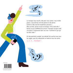 Sous la forme de quinze questions-réponses, Ingrid Seithumer propose une brève encyclopédie de la musique. D'une langue malicieuse, invitant à la curiosité, l'autrice explore l'histoire des instruments, s'intéresse aux grands musiciens, détaille la composition d'un morceau et explique le sens des notes. La qualité des illustrations de Bruno Gibert fait presque entendre les musiques citées ! Avec un sens de l'humour et du détail remarquable, l'au-trice évoque la musique préférée des singes et des chiens sans oublier ce qui se passe dans le cerveau humain quand on entend un morceau qu'on aime bien. Cet album vulgarise des concepts compliqués et les rend accessibles pour les plus jeunes. Les enfants apprendront de nombreuses choses sur les ver-tus de la musique ou l'utilité de jouer d'un instrument. Un ouvrage pour devenir un vrai mélomane!