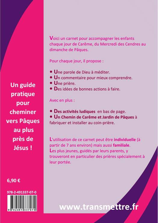 Voici un carnet pour accompagner les enfants chaque jour du Carême, du Mercredi des Cendres au Dimanche de Pâques. Pour chaque jour, il propose : Une parole de Dieu à méditer. Un commentaire pour mieux comprendre. Une prière. Des idées de bonnes actions à faire. Avec en plus : Des activités ludiques en bas de page. Un Chemin de Carême et Jardin de Pâques à fabriquer et installer au coin-prière. L'utilisation de ce carnet peut être individuelle (à partir de 7 ans environ) mais aussi familiale. Les plus jeunes, guidés par leurs parents, y trouveront en particulier des prières spécialement à leur portée.