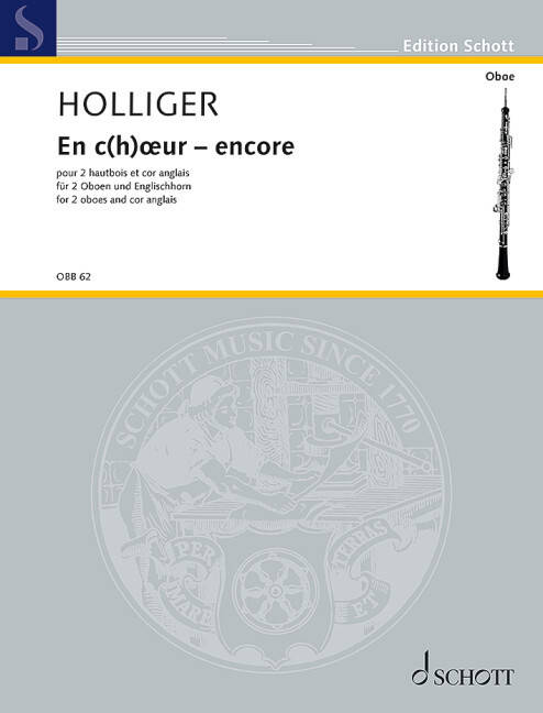 En C(h)oeur is a birthday present for Marie-Lise Schüpbach, born out of a sigh (concerning Holliger's music): „If only you could write something in C major, not so chromatic, and without quarter-notes and complicated rhythms! Instrumentation: 2 oboes and cor anglais