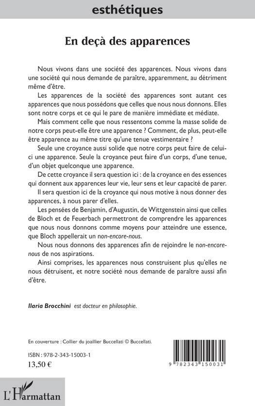 Nous vivons dans une société des apparences et il sera question ici de la croyance qui nous motive à nous en donner, à nous parer d'elles. Les pensées de Benjamin, Augustin et Wittgenstein, Bloch ou Feuerbach permettront de comprendre ces apparences comme moyens pour atteindre une essence, un non-encore-nous, celui de nos aspirations que nous tentons de rejoindre. Ainsi comprises, les apparences nous construisent et notre société nous demande de paraître afin d'être.