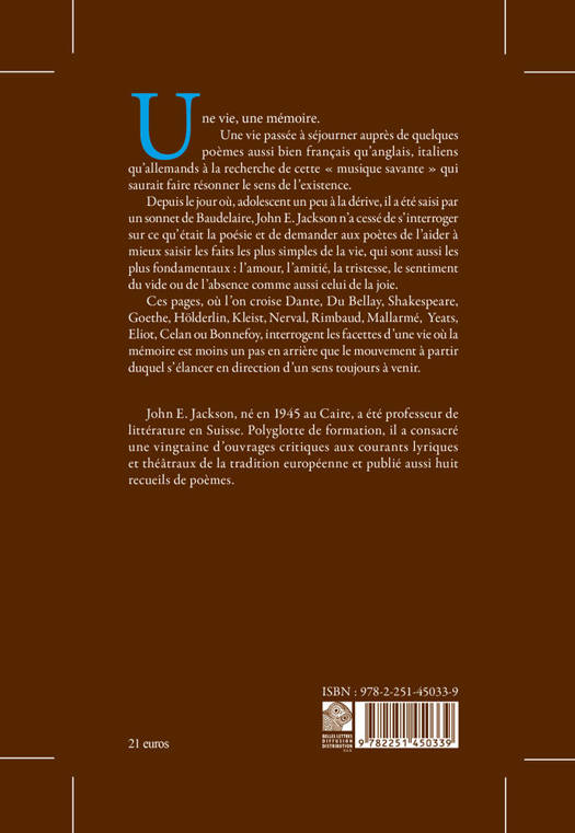 Une vie, une memoire. Une vie passee a sejourner aupres de quelques poemes aussi bien francais qu'anglais, italiens qu'allemands a la recherche de cette musique savante qui saurait faire resonner le sens de l'existence. Depuis le jour ou, adolescent un peu a la derive, il a ete saisi par un sonnet de Baudelaire, John E. Jackson n'a cesse de s'interroger sur ce qu'etait la poesie et de demander aux poetes de l'aider a mieux saisir les faits les plus simples de la vie, qui sont aussi les plus fondamentaux: l'amour, l'amitie, la tristesse, le sentiment du vide ou de l'absence comme aussi celui de la joie. Ces pages, ou l'on croise Dante, Du Bellay, Shakespeare, Goethe, Holderlin, Kleist, Nerval, Rimbaud, Mallarme, Yeats, Eliot, Celan ou Bonnefoy, interrogent les facettes d'une vie ou la memoire est moins un pas en arriere que le mouvement a partir duquel s'elancer en direction d'un sens toujours a venir.