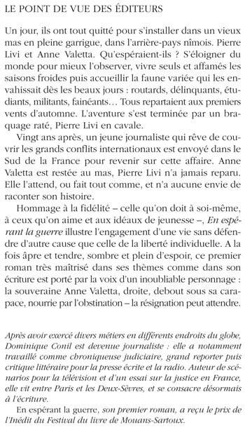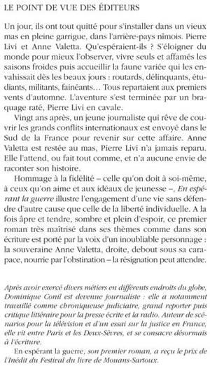 Hommage à la fidélité - celle qu'on doit à soi-même, à ceux qu'on aime et aux idéaux de jeunesse -, En espérant la guerre illustre l'engagement d'une vie sans défendre d'autre cause que celle de la liberté individuelle. A la fois âpre et tendre, sombre et plein d'espoir, ce premier roman très maîtrisé dans ses thèmes comme dans son écriture est porté par la voix d'un inoubliable personnage : la souveraine Anne Valetta, droite, debout sous sa carapace, nourrie par l'obstination - la résignation peut attendre. «»