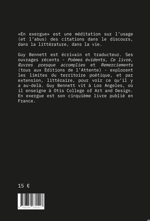 "En exergue" est une méditation sur l'usage (et l'abus) des citations dans le discours, dans la littérature, dans la vie. Il présente de manière parfois drôle, parfois grave une des questions primordiales de la littérature contemporaine, le cut up et la citation. Guy Bennet dans ce texte use et abuse de la citation dans un jeu en abîme dénonçant tout en utilisant. Le texte se compose d'une série d'épigraphes appariées et de gloses qui les commentent. Ces épigraphes sont organisées en cinq sections thématiques qui, dans leur ensemble, tracent une trajectoire allant de la conception (de l'écriture) à la mort. Ces sections sont ponctuées d'un choix de méta-épigraphes, certaines comiques, d'autres non, qui soulignent notre tendance à nous approprier et à recycler ce que d'autres avant nous ont dit. Comme le texte lui-même est truffé de citations, il est à la fois une discussion et un exemple de cette pratique.