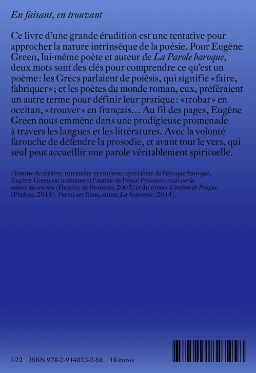 Ce livre est une tentative personnelle pour comprendre et expliquer ce qui fait la nature intrinsèque de la poésie. Eugène Green, qui a écrit lui-même de la poésie et qui a longtemps mis en scène les drames baroques, trouve dans ces deux mots les clés : les Grecs désignaient la poésie par un mot, poiÄsis, qui signifie "faire, fabriquer". Les poètes du monde roman, eux, se définissaient par un autre mot, "trobar" en occitan , "trouver" en français... Au fil des pages, Eugène Green nous emmène dans une prodigieuse promenade à travers les langues et les littératures.