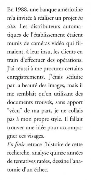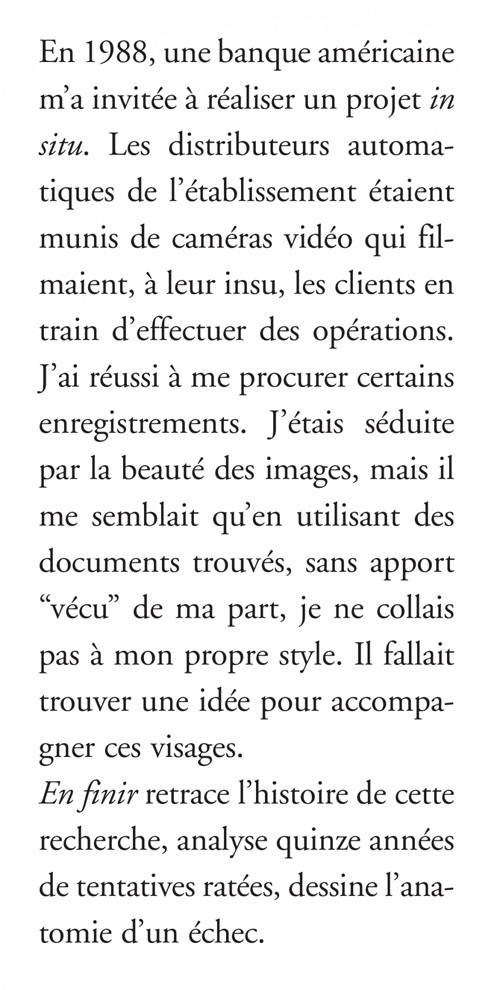 "En 1988, une banque américaine m'a invitée à réaliser un projet in situ. Quinze ans plus tard, j'ai décidé de retracer l'histoire de cette recherche, dessiner l'anatomie d'un échec, me libérer, enfin, de ces images. Abdiquer devant leur présence." (S. C.)