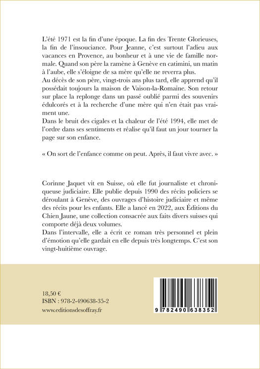 L’été 1971 est la fin d’une époque. La fin des Trente Glorieuses, la fin de l’insouciance. Pour Jeanne, c’est surtout l’adieu aux vacances en Provence, au bonheur et à une vie de famille normale. Quand son père la ramène à Genève en catimini, un matin à l’aube, elle s’éloigne de sa mère qu’elle ne reverra plus. Au décès de son père, vingt-trois ans plus tard, elle apprend qu’il possédait toujours la maison de Vaison-la-Romaine. Son retour sur place la replonge dans un passé oublié parmi des souvenirs édulcorés et à la recherche d’une mère qui n’en était pas vraiment une. Dans le bruit des cigales et la chaleur de l’été 1994, elle met de l’ordre dans ses sentiments et réalise qu’il faut un jour tourner la page sur son enfance.