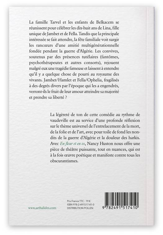 Un chalet cossu, avec terrasse donnant sur un lac, quelque part en France, en 2010. La famille Tarvel et les enfants de Belkacem se réunissent pour célébrer les dix-huit ans de Lina, fille unique de Jambet et de Fella. Tandis que la principale intéressée se fait attendre, la fête familiale voit surgir les rancoeurs d’une amitié multigénérationnelle fondée pendant la guerre d’Algérie. Les convives, soutenus par des présences tutélaires (fantômes, psychothérapeutes et autres consorts), rejouent malgré eux une tragédie fameuse et laissent à entendre qu'il y a quelque chose de pourri au royaume des vivants. Jambet/Hamlet et Fella/Ophelia, fragilisés à des degrés divers par l'époque qui les a engendrés, verront-ils le fruit de leur amour atteindre sa majorité et prendre sa liberté?<br /><br /><br /> La légèreté de ton de cette comédie au rythme de vaudeville est au service d’une profonde réflexion sur le thème universel de l'entrelacement de la mort, de la folie et de l'art, avec pour toile de fond les non-dits de la guerre d’Algérie et la douleur des Harkis. Avec <i>En fleur et en os</i>, Nancy Huston nous offre une pièce de théâtre puissante, tout en nuances, qui est à la fois oeuvre poétique et manifeste contre tous les obscurantismes.<br /><br /><br />