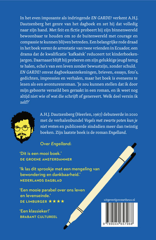 In het even imposante als indringende EN GARDE! verkent A.H.J. Dautzenberg het genre van het dagboek en zet hij dat volledig naar zijn hand. Met feit en fictie probeert hij zijn binnenwereld bewoonbaar te houden om zo de buitenwereld met courage en compassie te kunnen blijven betreden. Een belangrijke rode draad in het boek vormt de arrestatie van twee vrienden in Ecuador, een drama dat de kwalificatie ‘kafkaësk’ reduceert tot kinderboekenjargon. Daarnaast blijft hij proberen om zijn gelukkige jeugd terug te halen, echo’s van een leven zonder bewustzijn, zonder schuld.