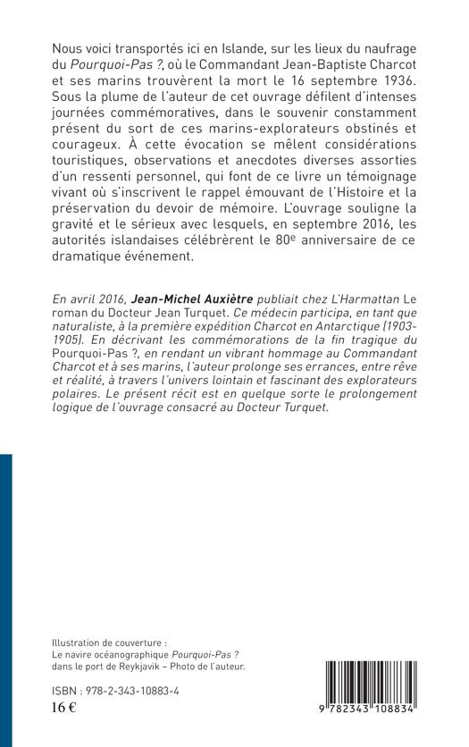Nous voici transportés ici en Islande, sur les lieux du naufrage du Pourquoi-Pas ?, où le Commandant Jean-Baptiste Charcot et ses marins trouvèrent la mort le 16 septembre 1936. Sous la plume de l'auteur de cet ouvrage défilent d'intenses journées commémoratives, dans le souvenir constamment présent du sort de ces marins-explorateurs obstinés et courageux. A cette évocation se mêlent considérations touristiques, observations et anecdotes diverses assorties d'un ressenti personnel, qui font de ce livre un témoignage vivant où s'inscrivent le rappel émouvant de l'Histoire et la préservation du devoir de mémoire. L'ouvrage souligne la gravité et le sérieux avec lesquels, en septembre 2016, les autorités islandaises célèbrent le 80e anniversaire de ce dramatique événement.