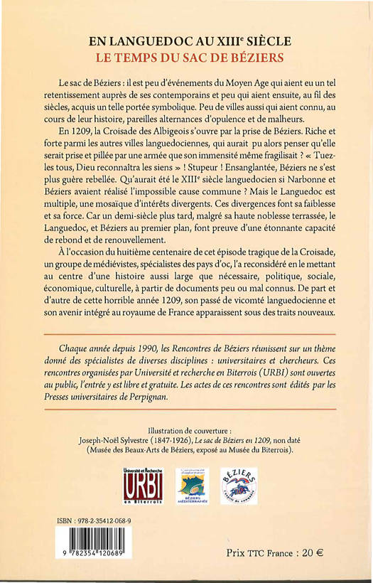 Le sac de Béziers : il est peu d'événements du Moyen Age qui aient eu un tel retentissement auprès de ses contemporains et peu qui aient ensuite, au fil des siècles, acquis un telle portée symbolique. Peu de villes aussi qui aient connu, au cours de leur histoire, pareilles alternances d'opulence et de malheurs.