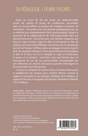 Ecrits au cours de 20 ans de vie professionnelle, ces articles et textes de conférences permettent une rencontre avec une pensée pédagogique, avec une éthique exigeante, avec une femme dont la passion est d'enseigner et de transmettre. Le lecteur découvrira la prédilection de l'auteur pour des thèmes comme le rapport à la parole et aux langues, l'éthique de la relation, le regard et l'écoute, le singulier et le pluriel, l'identité et l'altérité, l'ici et l'ailleurs.