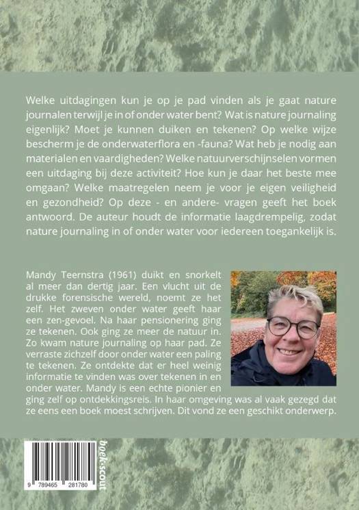 Welke uitdagingen kun je op je pad vinden als je gaat nature journalen terwijl je in of onder water bent? Wat is nature journaling eigenlijk? Moet je kunnen duiken en tekenen? Op welke wijze bescherm je de onderwaterflora en -fauna? Wat heb je nodig aan materialen en vaardigheden? Welke natuurverschijnselen vormen een uitdaging bij deze activiteit? Hoe kun je daar het beste mee omgaan? Welke maatregelen neem je voor je eigen veiligheid en gezondheid? Op deze - en andere- vragen geeft het boek antwoord. De auteur houdt de informatie laagdrempelig, zodat nature journaling in of onder water voor iedereen toegankelijk is.