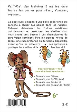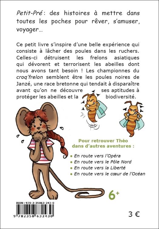 Cinquième tome des aventures de Théo, un petit mulot danseur et intrépide. - Ce petit livre s’inspire d’une belle expérience qui consiste à lâcher des poules dans les ruchers. Celles-ci détruisent les frelons asiatiques qui dévorent et terrorisent les abeilles dont nous avons tant besoin ! Les championnes du "croq’frelon" semblent être les poules noires de Janzé, une race bretonne qui tendait à disparaître avant qu’on ne découvre ses aptitudes à protéger les abeilles et la biodiversité... Dès 6 ans. - Illustrations : Matt7ieu Radenac