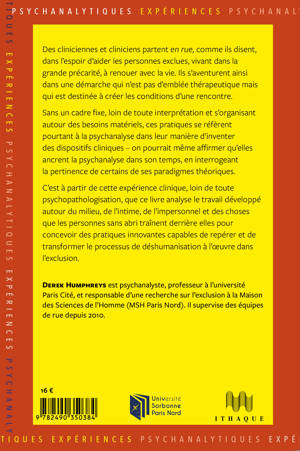 L’ouvrage rend compte de l'expérience de psychologues et de psychanalystes qui vont à la rencontre de la population qui vit dans la rue, en Ile-de-France ; leur but est de créer et d'offrir aux personnes exclues un dispositif clinique adapté à leur situation, en prenant en compte la problématique de la santé mentale dans les conditions de précarité et d'exclusion sociale.
