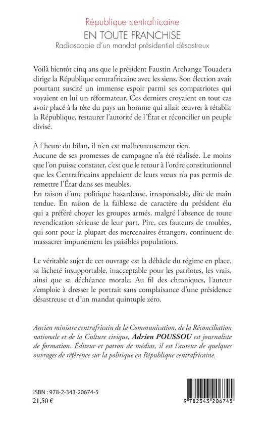 Voilà bientôt cinq ans que le président Faustin Archange Touadera dirige la République centrafricaine. Son élection avait pourtant suscité un immense espoir parmi ses compatriotes qui voyaient en lui un réformateur. Ces derniers croyaient en tout cas avoir placé à la tête du pays un homme qui allait oeuvrer à rétablir la République, restaurer l'autorité de l'État et réconcilier un peuple divisé. À l'heure du bilan, il n'en est malheureusement rien. Le sujet de cet ouvrage est la débâcle du régime en place, sa lâcheté insupportable, inacceptable pour les patriotes, les vrais, ainsi que sa déchéance morale. Au fil des chroniques, l'auteur s'emploie à dresser le portrait sans complaisance d'une présidence désastreuse et d'un mandat quintuple zéro.