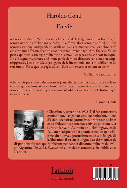 « En vie paraît en 1971. Sans avoir bénéficié de la fulgurance du « boom », le roman mérite d'être lu dans ce cadre. Il s'affirme alors comme ce qu'il est : un roman ascétique, indépendant, insulaire. Dans ce microcosme, les débâcles de ces êtres mis à l'écart, décrites avec obsession, restent actuelles. En cela, En vie peut expliquer la stratégie militante de l'écrivain engagé et de son sort tragique. Il a été séquestré, torturé et éliminé par la dernière dictature sans que son corps réapparaisse à ce jour. Mais, je suggère de le lire en oubliant la muséification de son auteur. Parce que les pages de son livre sont restées et restent en vie. » Guillermo Saccomanno « Je ne sais pas si cela a du sens mais je me dis chaque fois : raconte ce qu'il arrive aux gens comme si tu le chantais en y mettant tout ton cÅur, et si on ne se souvient pas de ton nom, que personne n'oublie la vieille et simple histoire que tu racontes. » Haroldo Conti