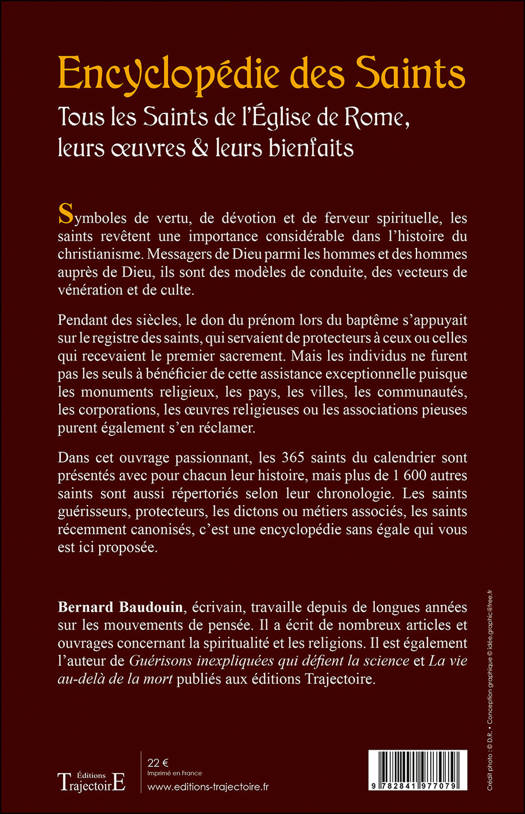 Symboles de vertu, de dévotion et de ferveur spirituelle, les saints revêtent une importance considérable dans l'histoire du christianisme. Messagers de Dieu parmi les hommes et des hommes auprès de Dieu, ils sont des modèles de conduite, des vecteurs de vénération et de culte. Pendant des siècles, le don du prénom lors du baptême s'appuyait sur le registre des saints, qui servaient de protecteurs à ceux ou celles qui recevaient le premier sacrement. Mais les individus ne furent pas les seuls à bénéficier de cette assistance exceptionnelle puisque les monuments religieux, les pays, les villes, les communautés, les corporations, les œuvres religieuses ou les associations pieuses purent également s'en réclamer. Dans cet ouvrage passionnant, les 365 saints du calendrier sont présentés avec pour chacun leur histoire, mais plus de 1 600 autres saints sont aussi répertoriés selon leur chronologie. Les saints guérisseurs, protecteurs, les dictons ou métiers associés, les saints récemment canonisés, c'est une encyclopédie sans égale qui vous est ici proposée.
