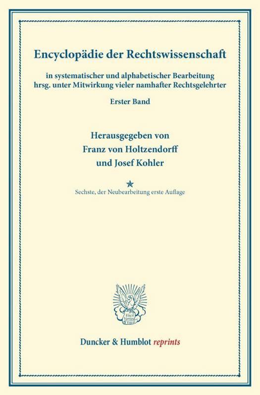 Die in zwei Bänden vorliegende "Encyklopädie" aus dem Jahr 1904 verfolgt den Zweck, "einerseits den Stand der gegenwärtigen deutschen Rechtswissenschaft aufzuzeigen, andererseits den Fortschritt anzubahnen und neue Keime in die Entwicklung der Jurisprudenz zu legen. Die Rechtsforschung ist in den letzten dreißig Jahren in vielem eine andere geworden. Das bürgerliche Recht, die historischen Studien des römischen, deutschen und kirchlichen Rechtes haben ganz andere Wege eingeschlagen, Philosophie und Rechtsvergleichung haben ein neues Angesicht gewonnen, das Strafrecht ist in ein neues Stadium der Forschung eingetreten, die Prozeßwissenschaft ward geschichtlich und konstruktiv neu gebaut, das internationale Privatrecht neu belebt, das Handelsrecht wesentlich erweitert, vor allem ist aber auf allen Gebieten des öffentlichen Rechts ein erfreulicher Aufschwung zu verzeichnen. Die frühere einseitige Methode des Rechtsstudiums wurde überwunden, indem auch das öffentliche Recht eine wesentlich konstruktive Bearbeitung erfuhr und so dem bürgerlichen Rechte ebenbürtig geworden ist. Möge die "Encyklopädie" eine Zeugin der Errungenschaften sein, welche die deutsche Rechtswissenschaft heute auf allen diesen Gebieten zu verzeichnen hat; möge sie zum eifrigen Weiterstudium anregen!" (aus dem Vorwort)