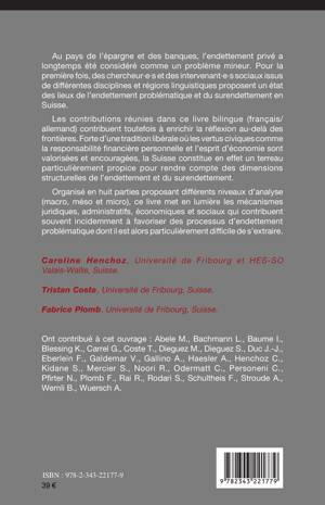 Au pays de l’épargne et des banques, l’endettement privé a longtemps été considéré comme un problème mineur. Pour la première fois, des chercheurs et des intervenants sociaux proposent un état des lieux de l’endettement problématique et du surendettement en Suisse. Les contributions réunies dans ce livre bilingue (français/allemand) contribuent toutefois à enrichir la réflexion au-delà des frontières. Forte d’une tradition libérale où les vertus civiques comme la responsabilité financière personnelle et l’esprit d’économie sont valorisées et encouragées, la Suisse constitue en effet un terreau propice pour rendre compte des dimensions structurelles de l’endettement et du surendettement. Cet ouvrage met en lumière les mécanismes juridiques, administratifs, économiques et sociaux qui favorisent ces processus d’endettement.