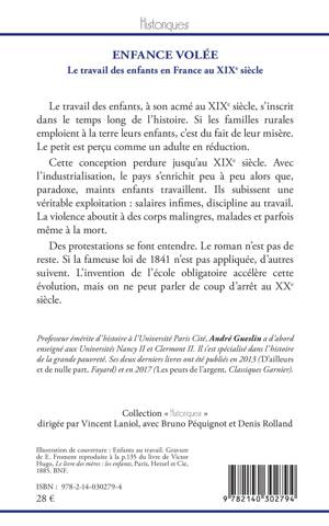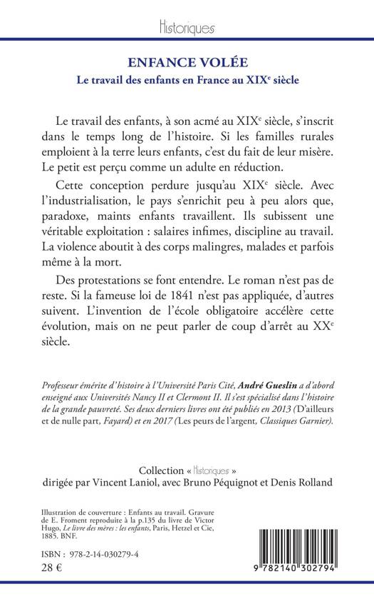 Le travail des enfants, à son acmé au XIXe siècle, s'inscrit dans le temps long de l'histoire. Si les familles rurales emploient à la terre leurs enfants, c'est du fait de leur misère. Le petit est perçu comme un adulte en réduction. Cette conception perdure jusqu'au XIXe siècle. Avec l'industrialisation, le pays s'enrichit peu à peu alors que, paradoxe, maints enfants travaillent. Ils subissent une véritable exploitation : salaires infimes, discipline au travail. La violence aboutit à des corps malingres, malades et parfois même à la mort. Des protestations se font entendre. Le roman n'est pas de reste. Si la fameuse loi de 1841 n'est pas appliquée, d'autres suivent. L'invention de l'école obligatoire accélère cette évolution, mais on ne peut parler de coup d'arrêt au XXe siècle.