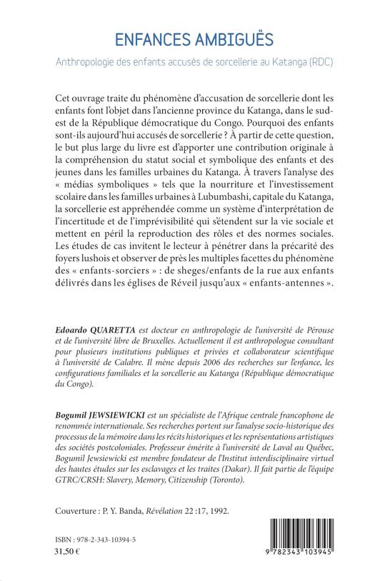 Cet ouvrage traite du phénomène d'accusation de sorcellerie dont les enfants font l'objet dans l'ancienne province du Katanga, dans le sud-est de la République démocratique du Congo. Pourquoi des sont-ils aujourd'hui accusés de sorcellerie ? À partir de cette question, le but plus large du livre est d'apporter une contribution originale à la compréhension du statut social et symbolique des enfants et des jeunes dans les familles urbaines du Katanga.