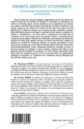 Plus de vingt ans ont passé depuis l'approbation de la Convention des Nations Unies sur les Droits de l'Enfant. Il est temps de concrétiser ces droits et d'évaluer quels sont leurs bénéfices. En se basant sur des situations concrètes dans différentes parties du monde, ce travail analyse comment les enfants "bénéficient" de leurs droits, comment ils en disposent et comment ils en font usage pour leur propre intérêt. Il révèle pourquoi ces droits doivent être compris en prenant en compte les contextes culturels et sociaux spécifiques.