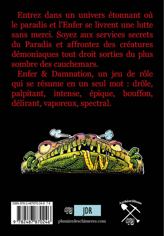 Entrez dans un univers étonnant où le paradis et l’Enfer se livrent une lutte sans merci. Soyez aux services secrets du Paradis et affrontez des créatures démoniaques tout droit sorties du plus sombre des cauchemars. Enfer & Damnation, un jeu de rôle qui se résume en un seul mot : drôle, palpitant, intense, épique, bouffon, délirant, vaporeux, spectral. Contient des textes inédits de Pierre Rosenthal, Jean Balczesak et Didier Guiserix.