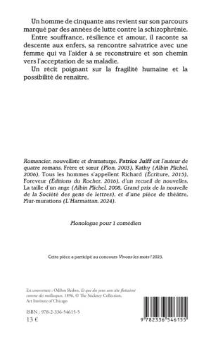 Un homme de cinquante ans revient sur son parcours marqué par des années de lutte contre la schizophrénie. Entre souffrance, résilience et amour, il raconte sa descente aux enfers, sa rencontre salvatrice avec une femme qui va l'aider à se reconstruire et son chemin vers l'acceptation de sa maladie. Un récit poignant sur la fragilité humaine et la possibilité de renaître.
