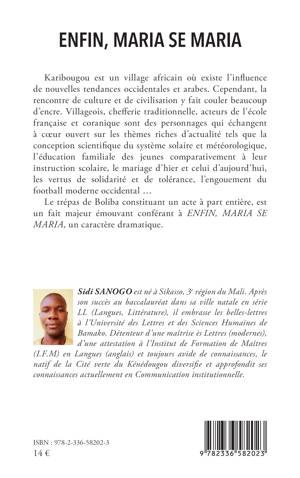 Karibougou est un village africain où existe l'influence de nouvelles tendances occidentales et arabes. Cependant, la rencontre de culture et de civilisation y fait couler beaucoup d'encre. Villageois, chefferie traditionnelle, acteurs de l'école française et coranique sont des personnages qui échangent à coeur ouvert sur les thèmes riches d'actualité tels que la conception scientifique du système solaire et météorologique, l'éducation familiale des jeunes comparativement à leur instruction scolaire, le mariage d'hier et celui d'aujourd'hui, les vertus de solidarité et de tolérance, l'engouement du football moderne occidental ... Le trépas de Boliba constituant un acte à part entière, est un fait majeur émouvant conférant à ENFIN, MARIA SE MARIA, un caractère dramatique.
