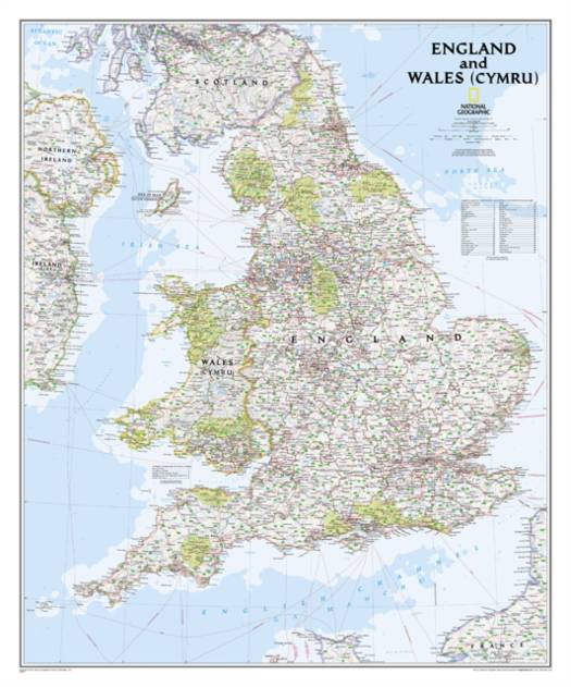 National Geographic's kaart van Engeland en Wales (Cymru) biedt uitzonderlijke details van twee van de drie regio's die deel uitmaken van het eiland Groot-Brittannië. De kaart heeft een helder kleurenpalet met blauwe oceanen en het reliëf wordt weergegeven door schaduweffecten, die al meer dan 75 jaar kenmerkend zijn voor National Geographic-kaarten. Administratieve indelingen zijn duidelijk afgelijnd en duizenden plaatsnamen, waaronder steden, historische locaties, waterpartijen, nationale parken en meer worden getoond. De transportinfrastructuur in de regio is ook gedetailleerd, met duidelijk aangegeven wegen, snelwegen, luchthavens, kanalen, veerbootroutes en hogesnelheidstreinen en passagiersspoorwegen. Kustdieptes wordt getoond met diepte curven en peilingen. Naast Engeland en Wales (Cymru) omvat de dekking delen van Schotland, Noord-Ierland, Ierland en Frankrijk.