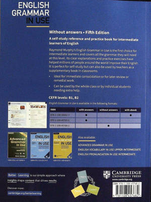 Raymond Murphy's English Grammar in Use is the first choice for intermediate (B1-B2) learners and covers all the grammar you will need at this level. This book without answers has clear explanations and practice exercises that have helped millions of people around the world improve their English. It is perfect for teachers to use in the classroom as a supplementary book, for extension work, or for homework activities.
