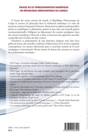 À l’instar des autres contrées du monde, la République Démocratique du Congo se retrouve de plain-pied dans la modernité numérique à la suite du processus continu d’expansion d’Internet. Bousculant les sphères professionnelles, privées et symboliques, le phénomène projette le pays dans une nouvelle galaxie communicationnelle, l’obligeant au dépassement des anciens paradigmes (issus des univers Gutenberg et Marconi) et donc à l’ouverture des approches nouvelles et plurielles dans l’analyse des faits sociaux. Chercheurs et professionnels de tous domaines intègrent ainsi dans leurs grilles de lecture des nouvelles conditions d’objectivation de la société congolaise contemporaine. Les auteurs sélectionnés pour ce neuvième numéro de la revue stratégique et internationale Dounia tentent de donner des contenus au concept de transformation numérique.