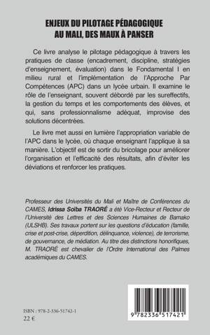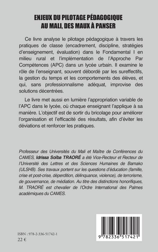 Ce livre analyse le pilotage pédagogique à travers les pratiques de classe (encadrement, discipline, stratégies d'enseignement, évaluation) dans le Fondamental I en milieu rural et l'implémentation de l'Approche Par Compétences (APC) dans un lycée urbain. Il examine le rôle de l'enseignant, souvent débordé par les sureffectifs, la gestion du temps et les comportements des élèves, et qui, sans professionnalisme adéquat, improvise des solutions décentrées. Le livre met aussi en lumière l'appropriation variable de l'APC dans le lycée, où chaque enseignant l'applique à sa manière. L'objectif est de sortir du bricolage pour améliorer l'organisation et l'efficacité des résultats, afin d'éviter les déviations et renforcer les pratiques.