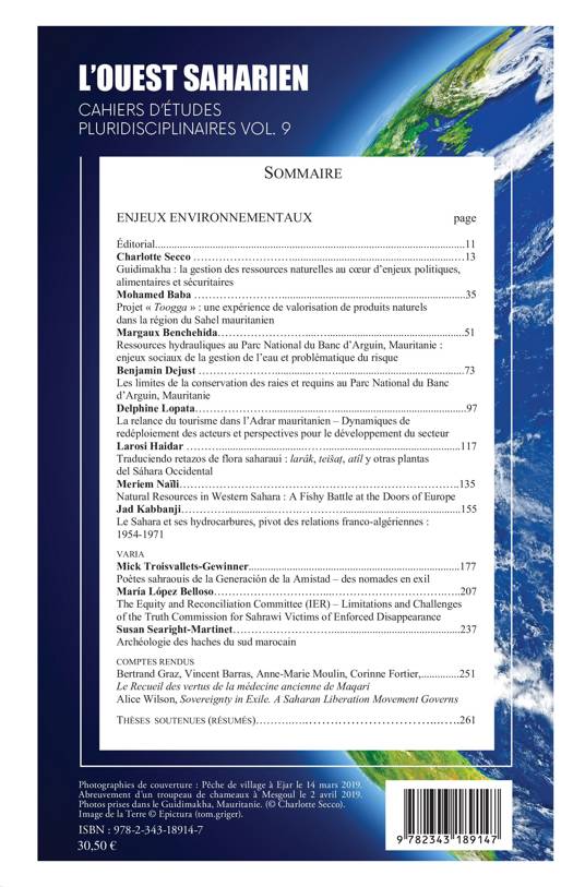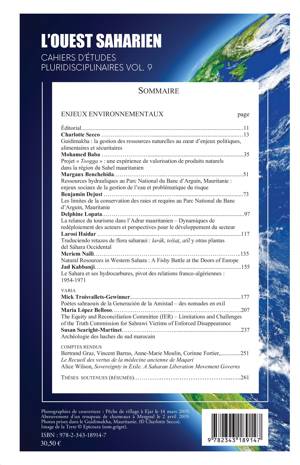 Ce numéro des cahiers pluridisciplinaires de L'Ouest saharien met à l'honneur la question environnementale. Y sont traitées aussi bien la problématique de la conservation des espèces marines menacées dans le Parc National du Banc d'Arguin que la question de la gestion de l'eau douce menacée de pollution par l'orpaillage à Chami. Il aborde également les compétitions autour des ressources naturelles de la région, les accords de pêche Union européenne-Maroc, l'économie du tourisme, le changement climatique et ses impacts sur la sécurité alimentaire.