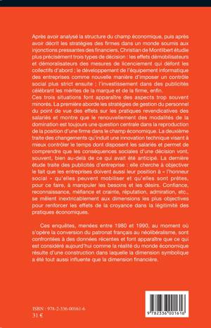 Ce livre analyse tout d'abord la structure du champ économique et décrit les stratégies des firmes dans un monde soumis aux injonctions pressantes des financiers. Il étudie ensuite trois types de décision : les mesures de licenciement qui défont les collectifs ; le développement de l'équipement informatique comme manière d'imposer un contrôle social plus strict ; l'investissement dans les publicités célébrant les mérites de la marque et de la firme.
